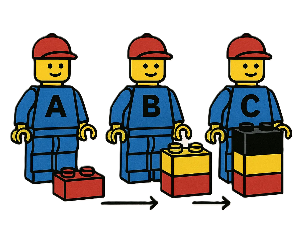 Let’s do another thought experiment. Imagine somebody is asked to step into an organization they don’t know, with complicated workflows and invisible intermediary deliverables and artefacts. Maybe they’re a new manager or invited as an advisor. Imagine they “arrive at the scene” cold in our little Lego workflow. What will their observation probably be? “There’s a problem with Team B. They cannot handle their workload. Their productivity problem is holding everything up.”