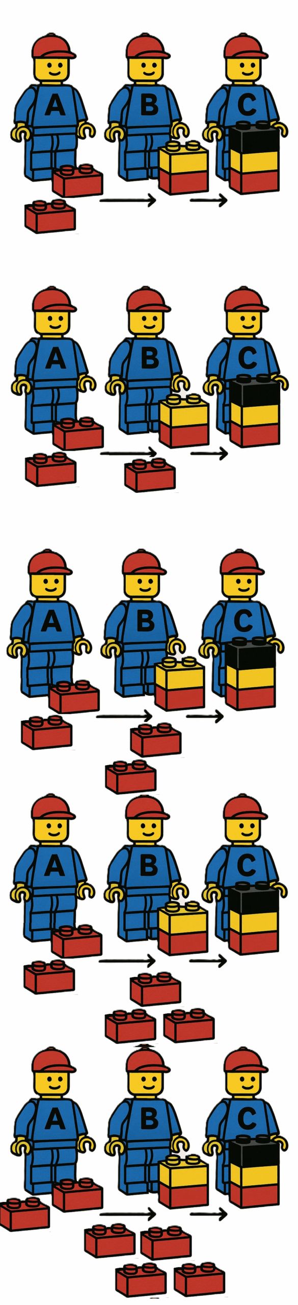 By the end of the week, you are a little confused… Team A totally delivered on their improvement initiative and produce 2 red bricks per day. On the first day, Team B nicely processes the red brick of the previous day, but on the second day they end up with a spare red brick. Likewise on day 3 and 4, they get more red bricks than they can process, and this intermediate work is beginning to pile up at Team B. Team C still continues to see the same red+yellow intermediate come through at a pace of one per day, and completes the work for customer delivery by adding their black brick.